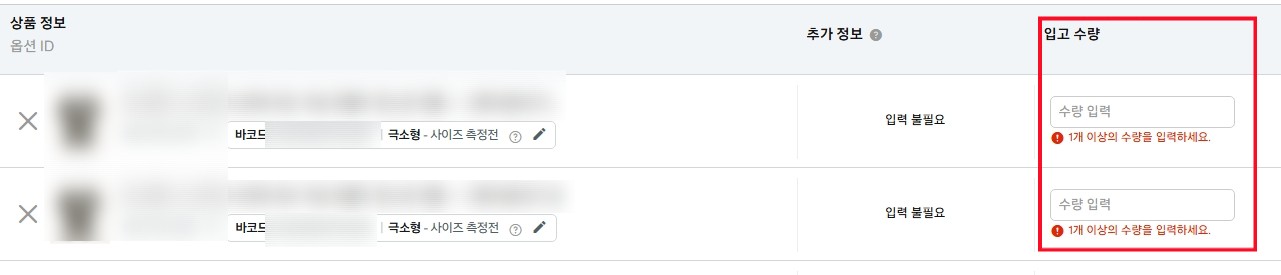 이제 다음으로 넘어오면 각 입고 수량을 입력해주면 됩니다.