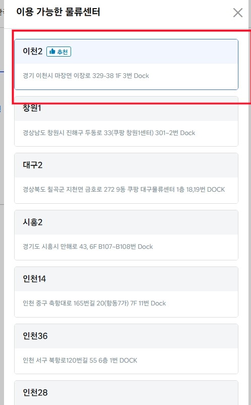 입고 가능한 물류센터가 나오고 쿠팡 시스템에서 추천해주는 센터를 선택하시거나, 평소 판매자배송으로 쿠팡에서 자주 주문이 들어오는 지역이 해당되는 센터로 입고시키면 재고 회전이 더 빨리될 가능성이 높아집니다.