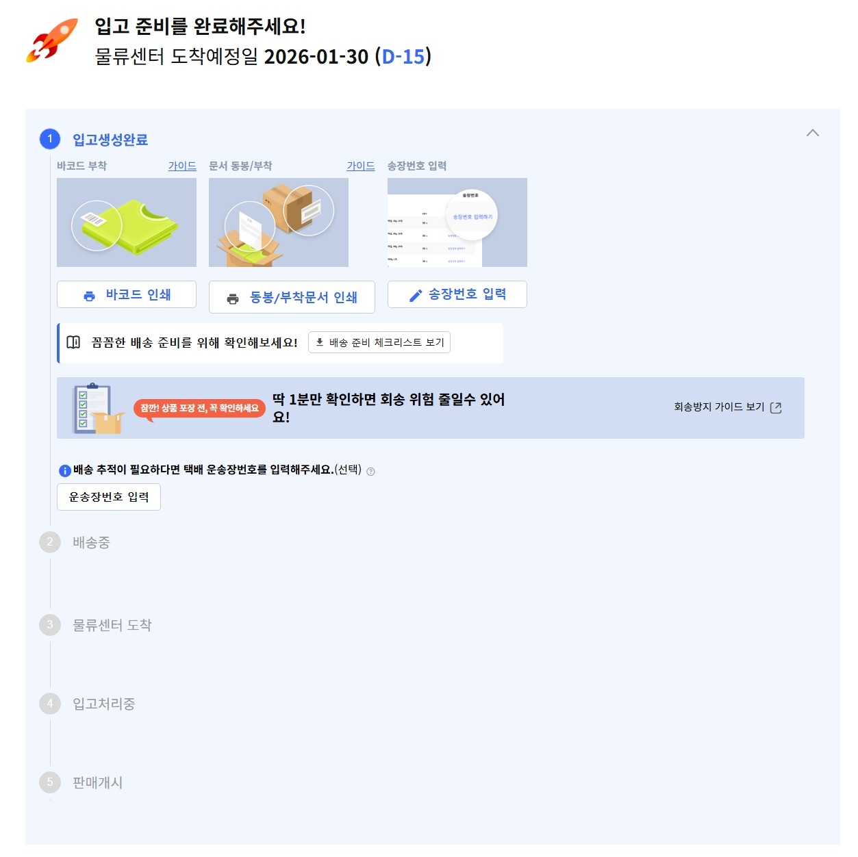 지정된 풀필먼트 센터(CFS)로 발송한 뒤, WING에서 상태가 '입고 완료'로 바뀌는지 확인하세요.
