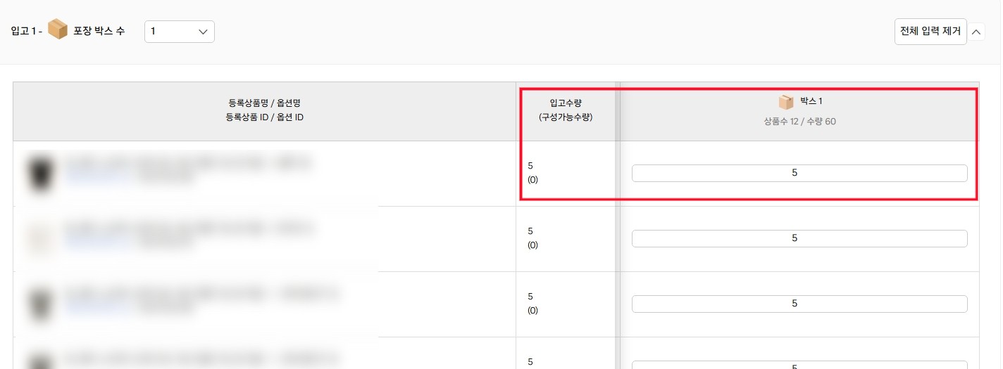 그리고 박스 당 넣을 수량을 입력해주세요! (입고수량과 동일하게 입력해야 합니다!)