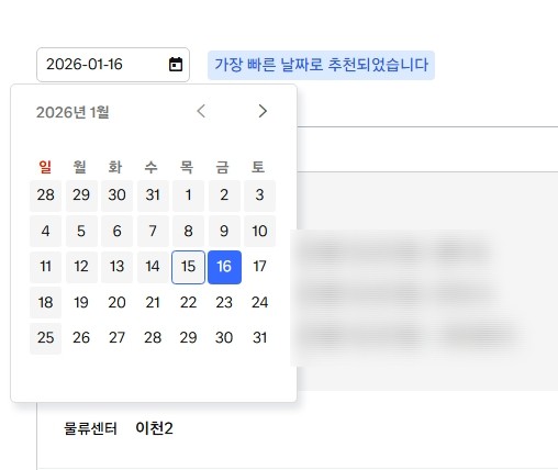 그리고 실제로 쿠팡 물류센터에 입고시킬 날짜를 정해주시면 되는데요. 여기서는 실제로 포장을 마치고 택배&밀크런을 이용해서 계산해야하기 때문에 발송일 기준 영업일 3일 이후 정도를 추천합니다.