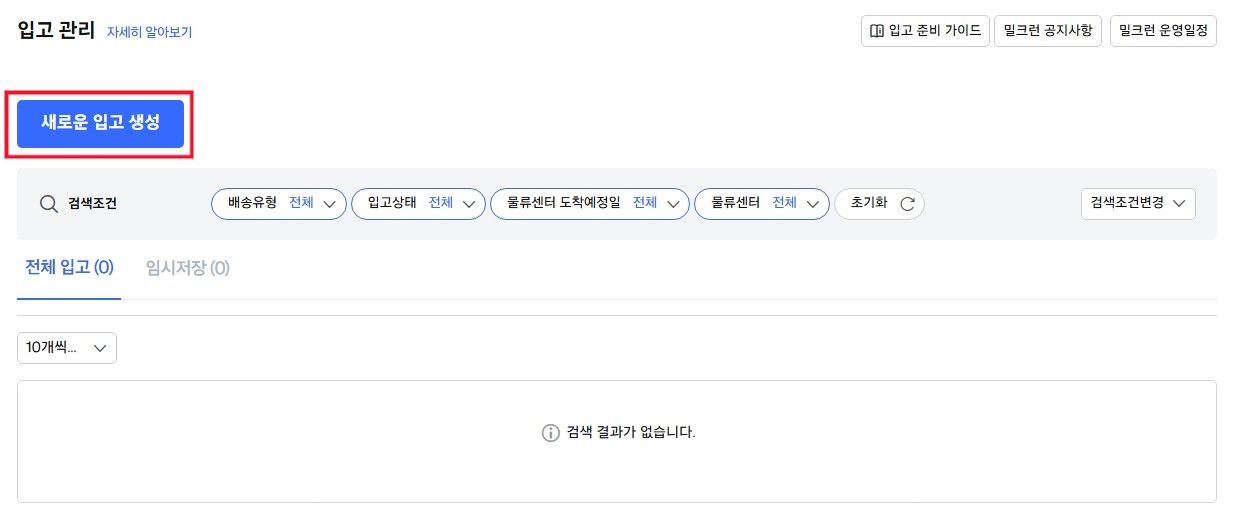 상단에 "새로운 입고 생성" 클릭!