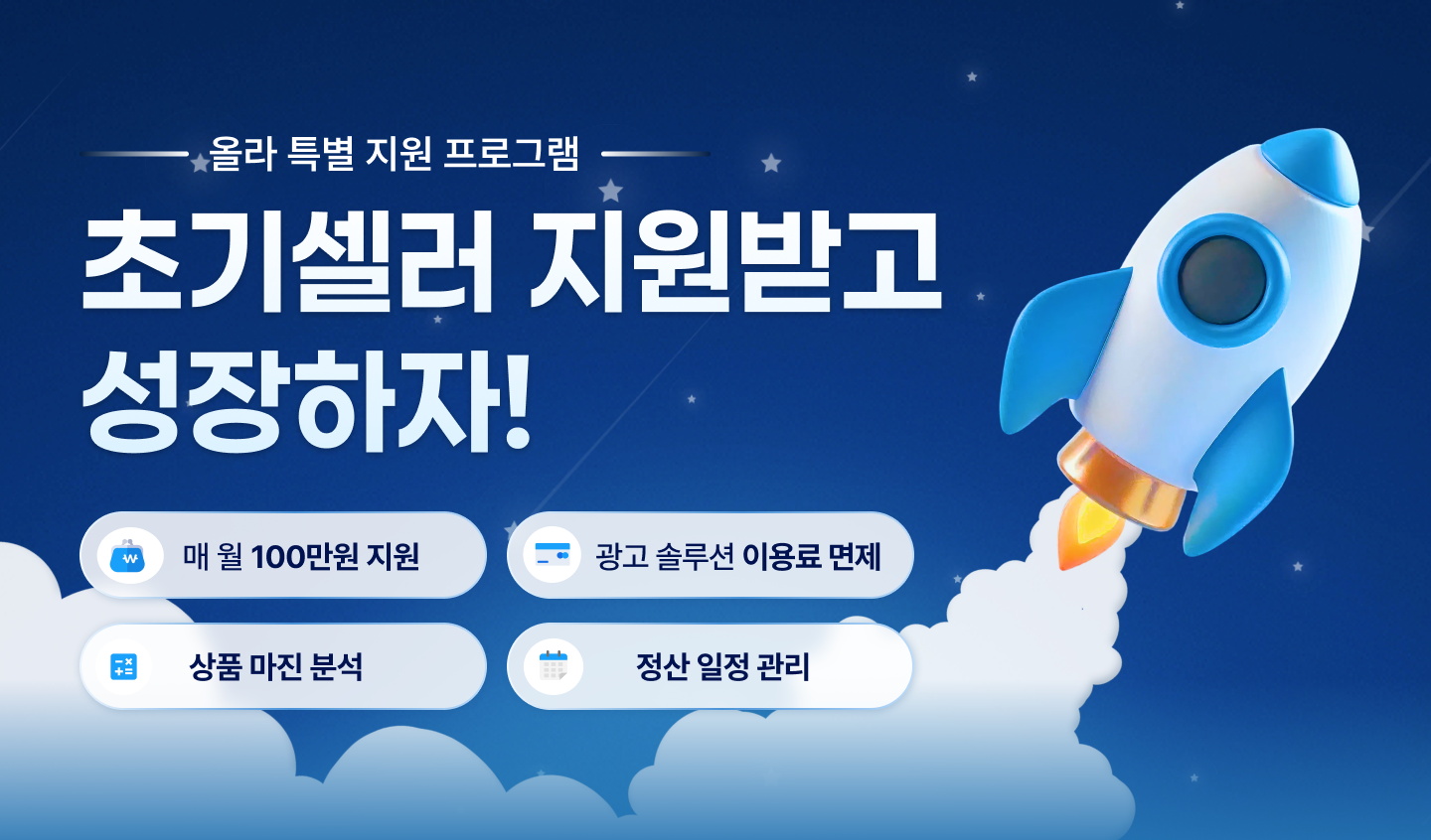 초기 셀러가 딱 힘들어하는 부분인 <광고/ 정산/ 마진> 관련 기능 + 비용을 모두 지원해드려요!