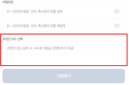 회원 가입 시, 추천인 코드를 입력하면 수수료 지원금을 추가로 받을 수 있어요!